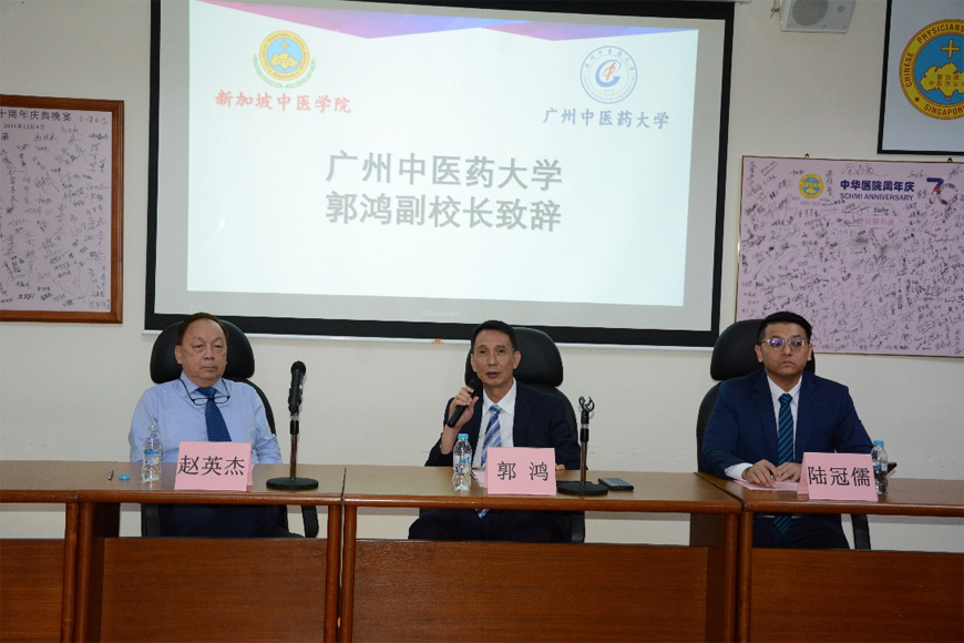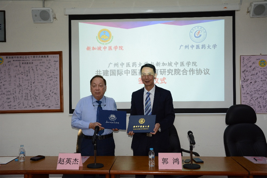 本次协议由我院董事主席赵英杰教授与广州中医药大学对外交流合作部陆冠儒副部长正式签署,广州中医药大学郭鸿副校长、新加坡中医学院董事主席副主席赵卫权博士、张俊勇秘书长等共同出席并见证签约仪式。