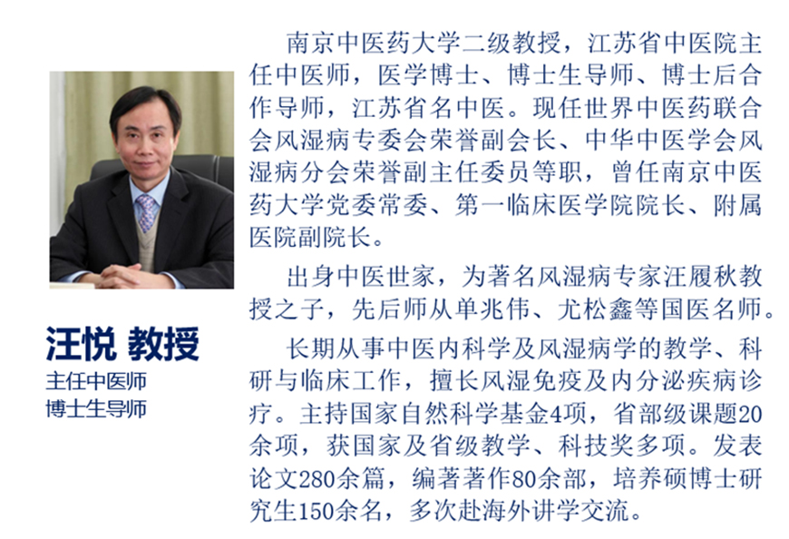 汪悦教授现为南京中医药大学二级教授、主任中医师、博士生及博士后导师,江苏省名中医,担任多项国家及省级学术职务,是中医内科学中国教学团队带头人、首批国家一流本科课程负责人。出身于中医世家,为名老中医汪履秋之子,师从全国名中医、著名脾胃病专家单兆伟教授。全国第三批名老中医学术继承人,师从著名中医肝病专家尤松鑫教授。长期从事中医内科学与风湿病学教学、科研及临床工作,擅长风湿免疫与内分泌疾病诊治。主持国家自然科学基金4项及多项省部级课题,获多项科技与教学成果奖,发表论文280余篇,著作80余部,培养硕博士研究生150余名。